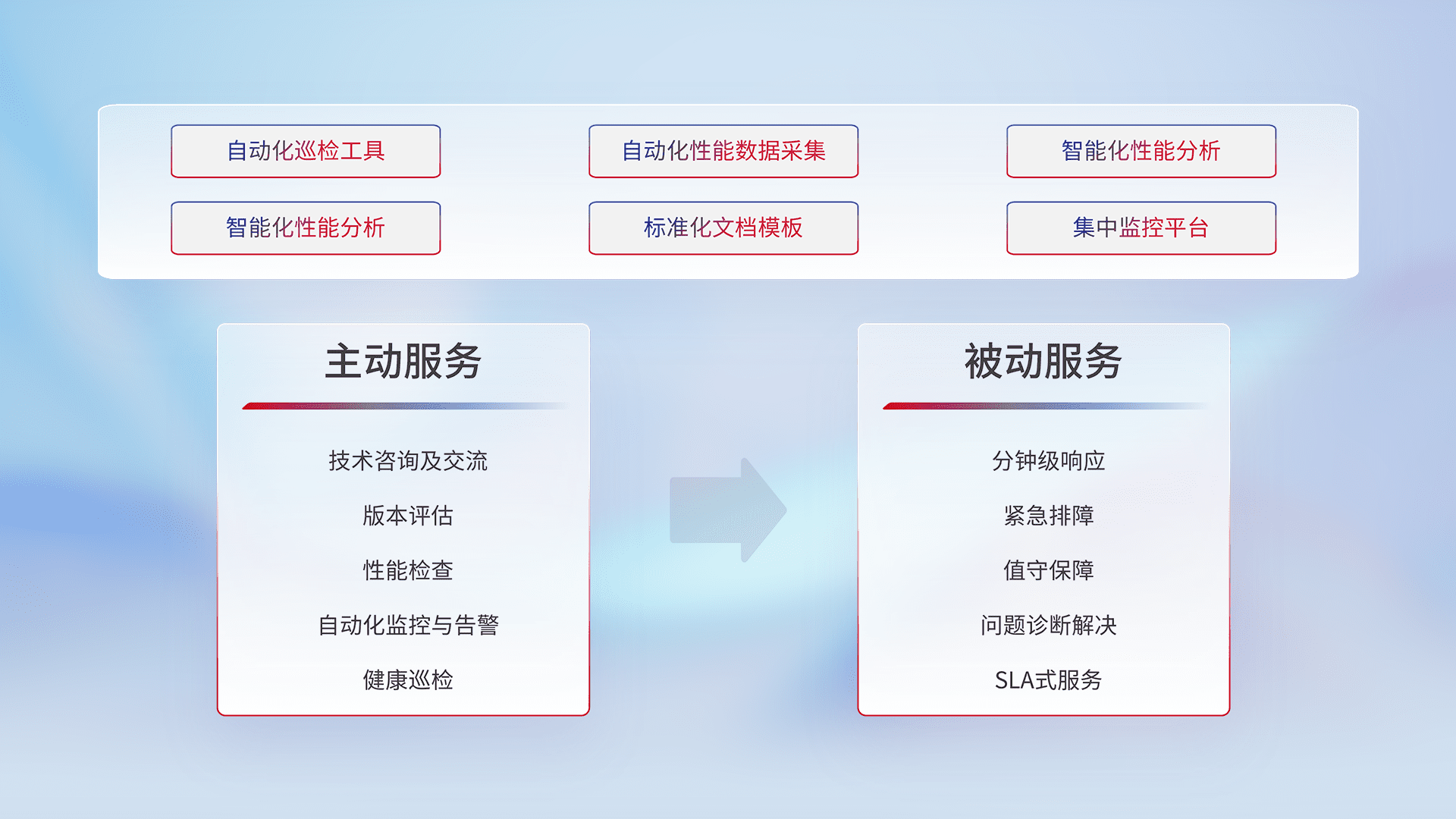 智能化工具和标准化文档,,,保障服务质量,,,提供主动服务(包含技术咨询、、版本评估、、性能检查、、自动化监控与告警、、、、健康巡检)和被动服务包含(分钟级响应、、紧急排障、、值守保障、、、、问题诊断解决、、SLA服务)。。
